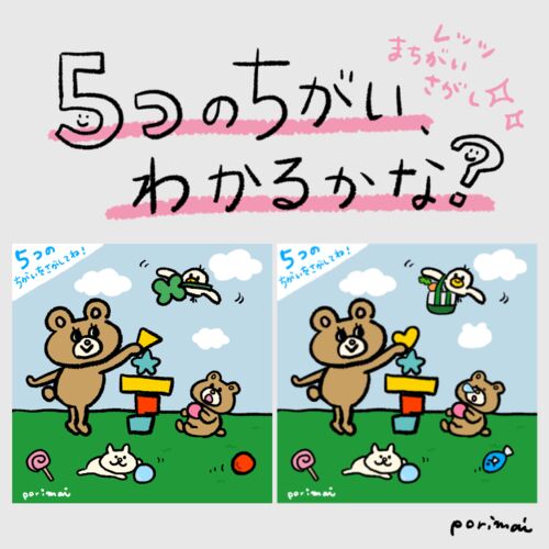 まちがいさがし 5つのまちがいさがし左 5つの間違い探し右 まちがいさがし答え 4歳長女が今はまっているのが「まちがいさがし」などちょっぴり知的な遊び。そんな自分ちのために、超簡単なまちがいさがし作ってみました。「小さい子どもと家に居続ける時の…